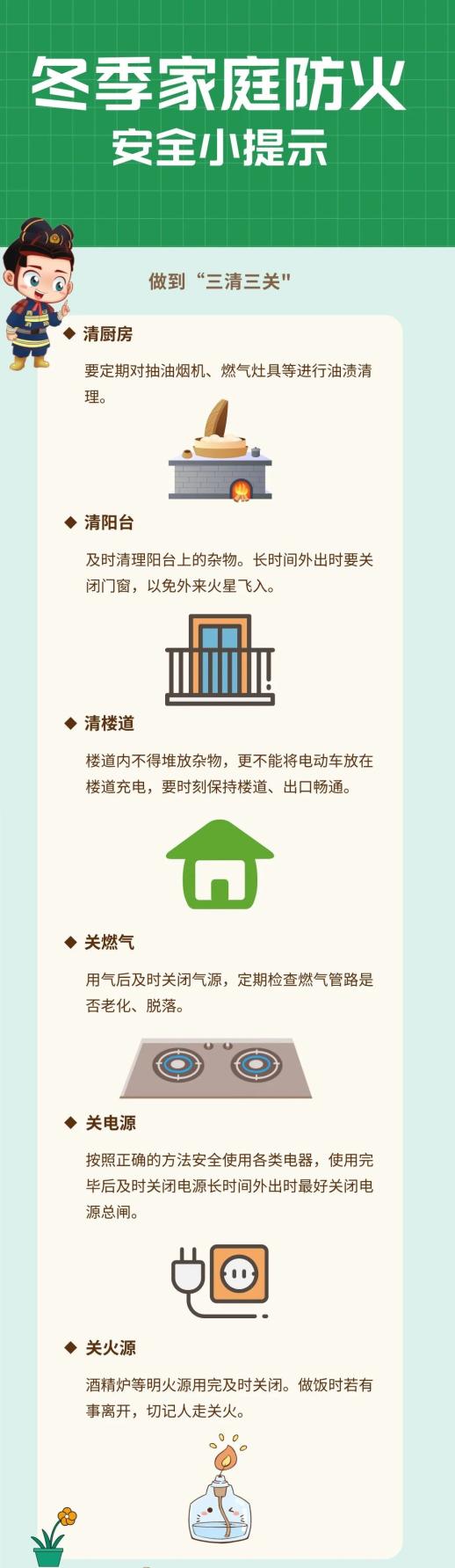 同时,提醒居民及时清理阳台、楼道、厨房,不要在楼梯口、楼梯间堆放杂物、不违规停放电动自行车,做好家庭“三清三关”,将家庭消防安全意识根植于心中,主动排查整改家中火灾隐患,最大限度降低家庭火灾事故的发生。